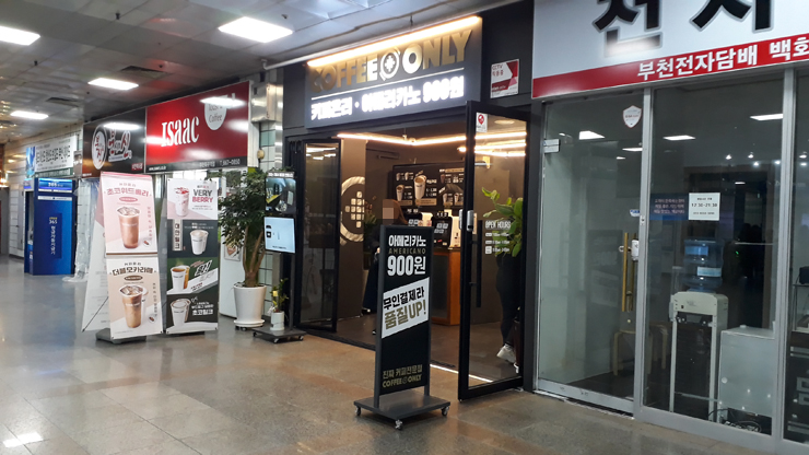한국에 있는 동안 집에서 커피를 내려 마시다가 이날따라 못마시고 나와서 헤롱거리고 있는데 부천역 지하철 개찰구 입구에 똭! 900원짜리 원두커피 전문점이 있더라구요! 한 눈에 봐도 익숙한 비주얼!!! 눈길이 가지 않을 수가 없었습니다.