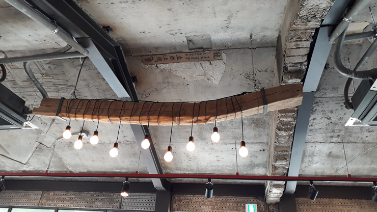 대들보를 이용해 조명을 내리고 건축일이 쓰여진 보를 살려둔 센스도 돋보이네요. 지붕 공간을 부순 파벽도 그대로 살려두었고요.