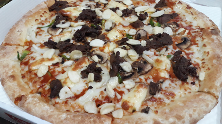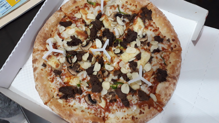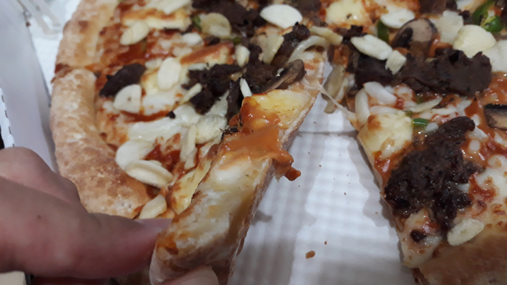 갈릭 후레이크가 뿌려진 스테이크 피자. 예전 피자 만드는 알바 경험자로서 가장자리 토핑이 제대로 되지 않아 살짝 아쉬운 감이 있지만 바쁘면 그럴 수도 있죠 뭐.