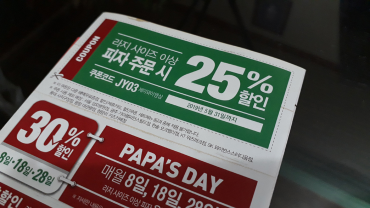 2019년 5월 31일까지 라지 사이즈 이상 주문시 무려 25% 할인!!!(다른 할인과 중복 안됨) 이건 온라인 뿐만 아니라 전화 주문에도 사용할 수 있어요. 전화로 콜센터 주문상담 직원에게 쿠폰 쓸거라 말하고 이 쿠폰 코드를 불러주면 되는데 배달 직원분에게 여쭤보니 쿠폰 안줘도 된다고 하더라구요. 전단지 돌린 쿠폰 코드번호가 다 똑같아서 여러번 사용할 수 있을 것 같아 공유합니다.