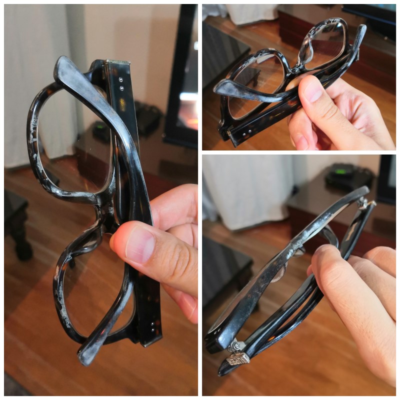 동남아에서 땀 흘리는 일도 많고 바다도 자주 가고 뭐... 샤워할 때에도...어느땐 안경을 끼고 잘 때도 일을 만큼 아주 거침없이 애용해준 덕분에 이렇게 허옇게 뿔테가 변색되어버리고 말았습니다. 예전엔 이렇게 변색된 뿔테는 그냥 버렸었던 기억이 납니다. 하지만 재작년 <노우즈힐링>이라는 업체를 알게된 후부터 이곳에 뿔테를 맡기고 있답니다.