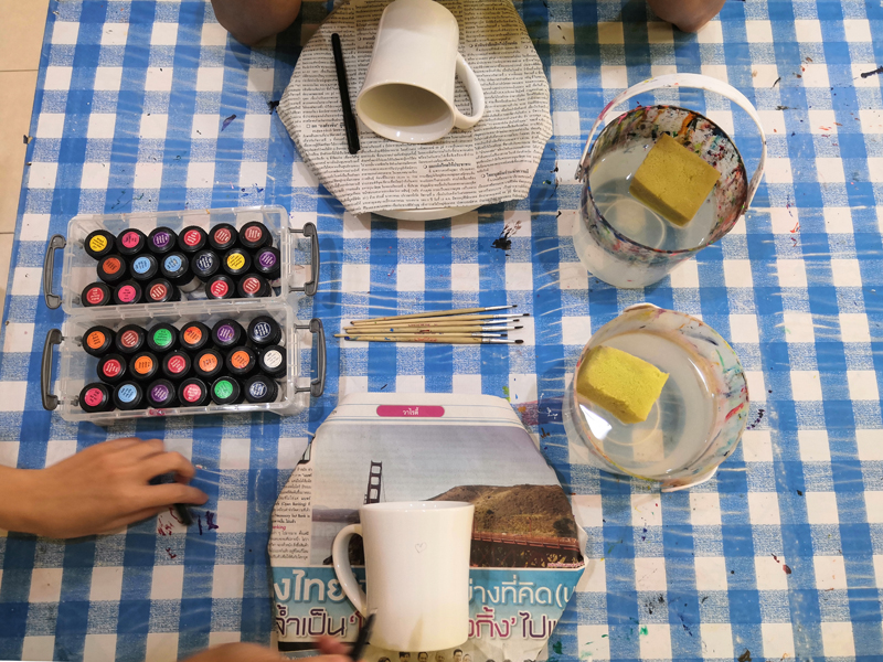 1. 만들어진 기성 컵이나 접시, 재떨이 등의 도자기 위에 채색하기(굽기까지 2시간 30분 정도 소요)