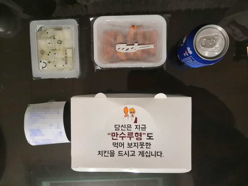 예상시간 40분이 되기도 전에 도착한 치킨치킨! 포장이 깔끔하네요! 치킨무와 콜라, 그리고 떡강정을 서비스로 주셨어요.