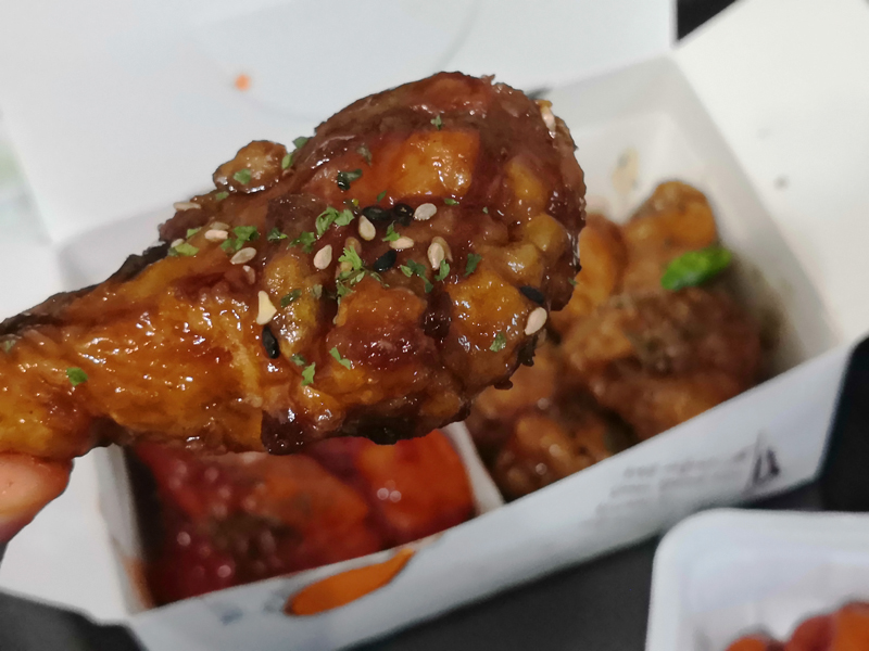 전체적으로 닭고기 자체에 육즙이 풍부해서 겉에 묻은 양념들이 한입 베어물 때마다 잘 어우러져서 따로 놀지 않고 퍽퍽하지 않고 맘에 들었어요. 리뷰에 보니까 좀 느끼하다는 분들이 계셨었는데 아마도 육즙이 살아있어서 그렇게 느끼신게 아닐까 합니다. 튀김옷이 얇은 편이라 오히려 기름기는 더 묻어나지 않았거든요.