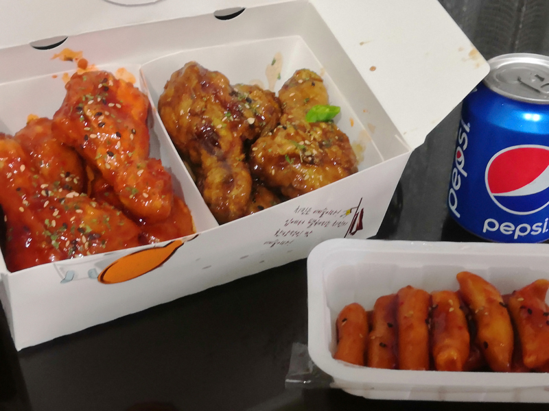 예상시간 40분이 되기도 전에 도착한 치킨치킨! 포장이 깔끔하네요! 치킨무와 콜라, 그리고 떡강정을 서비스로 주셨어요.