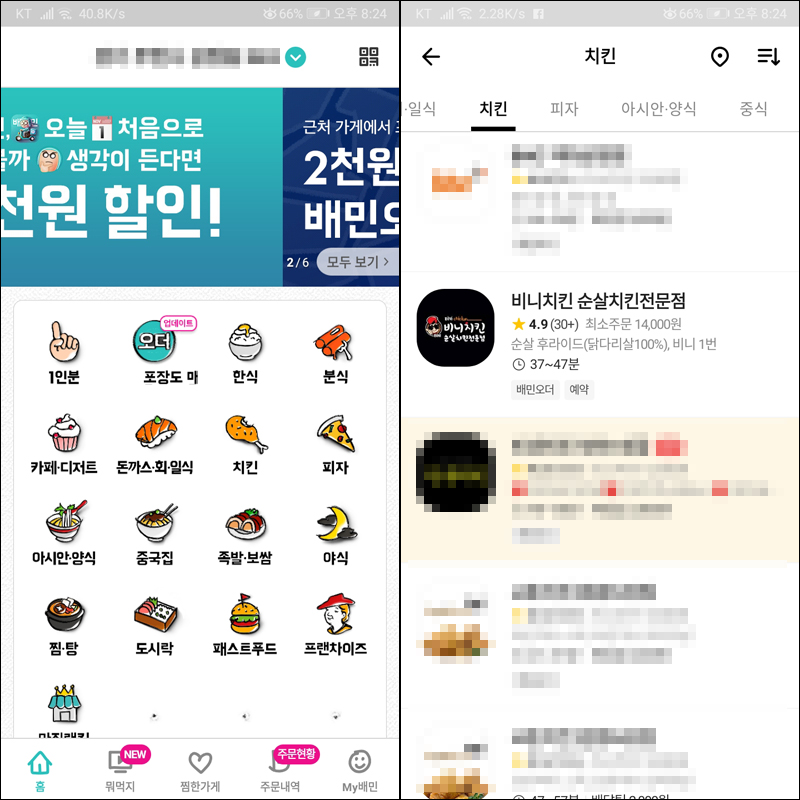 그리하여 배달 대표 앱인 배민으로 치킨 사냥에 나섰습니다. (요기요 앱 첫 가입하면 금액을 대폭 할인해준다는 광고를 보고 요기요 깔았다가 완전 실망 후 다시 배민으로 돌아왔답니다. 이와 관련한 포스팅은 추후에 따로 해드릴게요.)