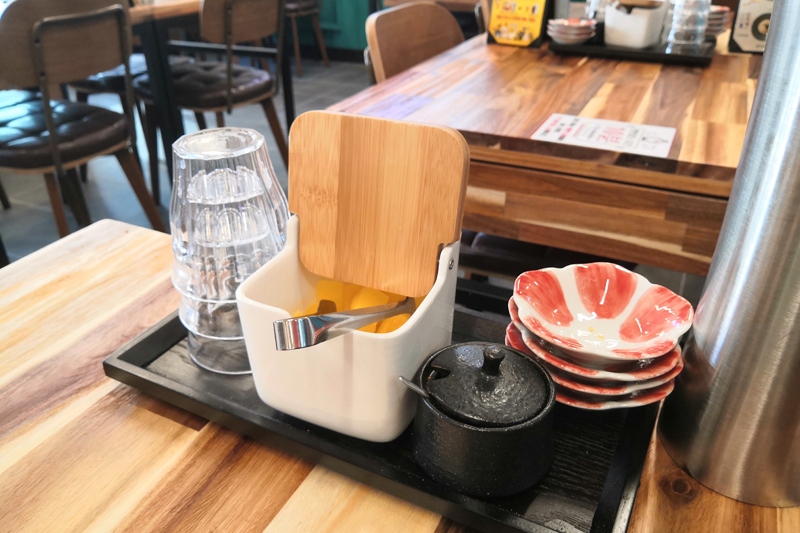 테이블 세팅은 대략 이 정도. 단무지와 시치미가 깔끔하게 담겨 있습니다.