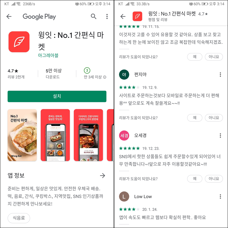 설마 하면서 앱 검색을 해보니 윙잇 앱도 개발이 되어있었습니다. 핸드폰에 용량 차지하는 걸 별로 좋아하지 않는 편이라 앱 깔 때마다 리뷰를 꼭 확인하는데 평이 나름 괜찮았어요! OK! 바로 설취!