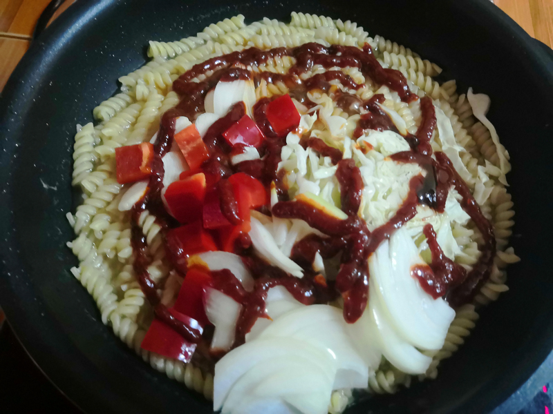 가장 먼저 아침에 고기를 굽던 프라이팬을 닦지도 않은채 ㅋㅋㅋ 물을 붓고 면을 투하합니다.