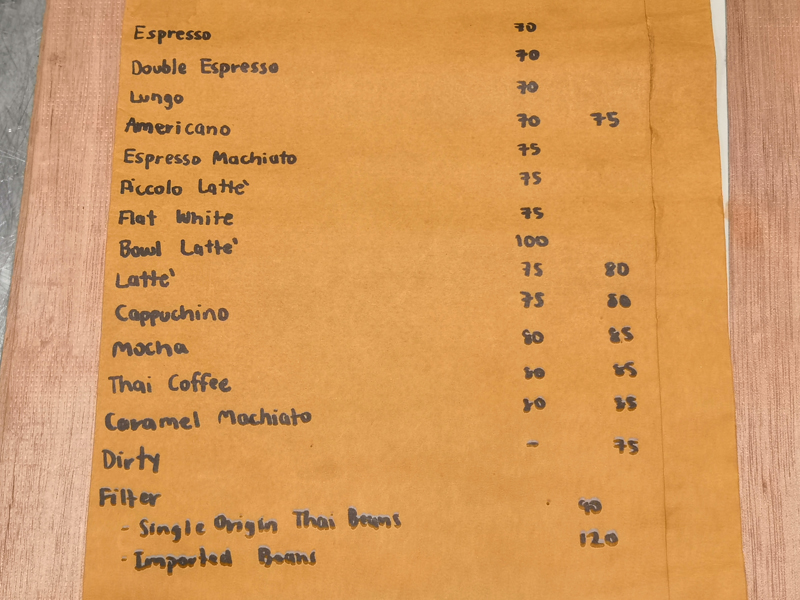 아참! 메뉴판도 찍어봤어요. 대충 이 가격대입니다. 아이스 아메리카노가 75밧이면 푸켓에서 나쁘지 않은 가격입니다.