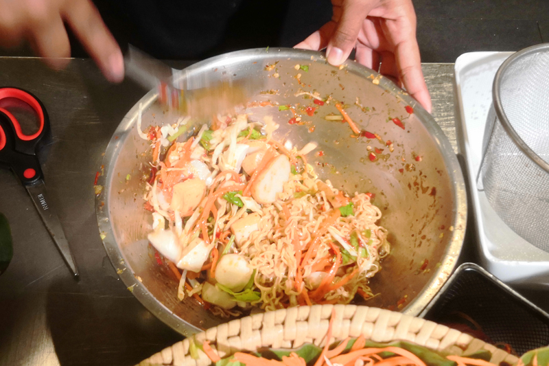 이제 잘 삶아진 재료와 면, 거기에 각종 야채들을 잘 버무려주면 끝!