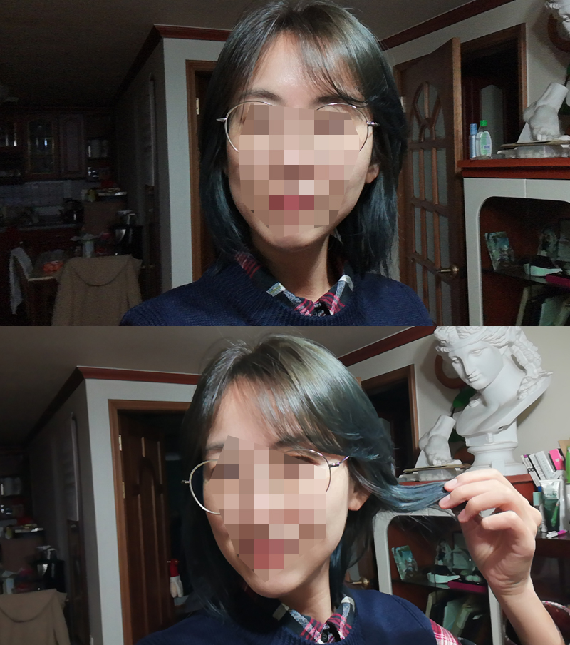 짜잔! 컬러는 에쉬 브라운 - 에쉬 딥블루라서 톤 다운된 블루 색을 띄는데 제 핸드폰이 잘못했네요. ㅋㅋㅋ 색이 제대로 나오질 않아서 집에서 다시 한 번 사진을 찍어보기로 했어요.