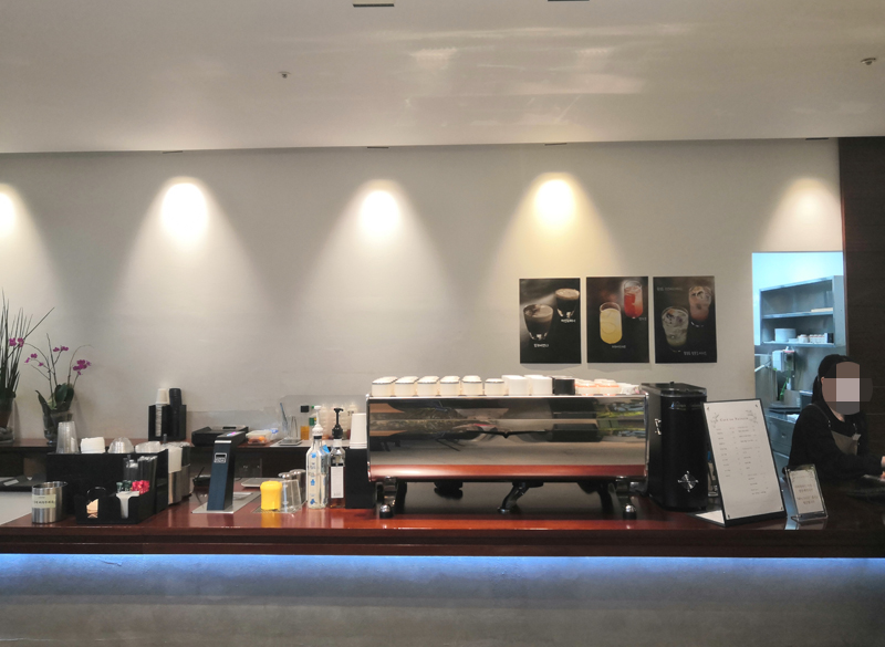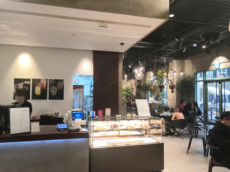 한쪽 벽면은 이끼와 다른 식물들로 채워져 있었고 콘크리트 노출 벽과 블랙 컬러가 제법 잘 어울리는 듯합니다. 딱 하나 단점이라면 카운터쪽은 널널한데 식물들이 있는 쪽의 테이블은 너무 다닥다닥 붙어 있어서 답답한 느낌도 들었어요. 이런 대형몰에서 카페의 테이블 회전율과 임대료를 생각한다면 어쩔 수 없는 선택이었으리라 이해도 됩니다.