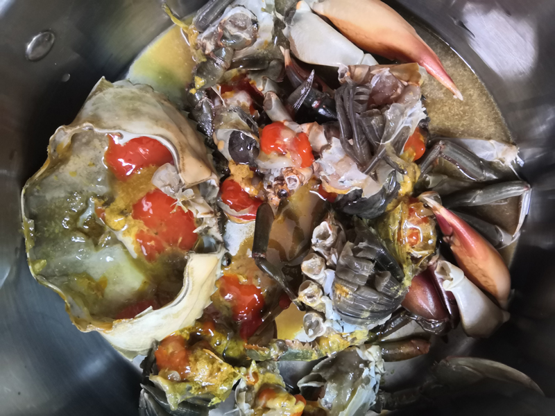 4. 아주 자작하게 게 껍질이 잠기려고 한다 싶을만큼 물을 채워주고 뚜껑을 덮은 후 중불에 15분간 쪄주면 끝!