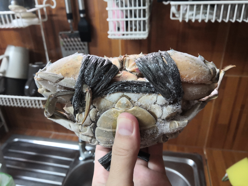 일단 해동 전에 집게를 단단하게 고정시킨 끈을 제거해줍니다. 집게발이 얼마나 무시무시하면 저렇게 꽁꽁 묶어놓은건지 짐작이 가시죠?