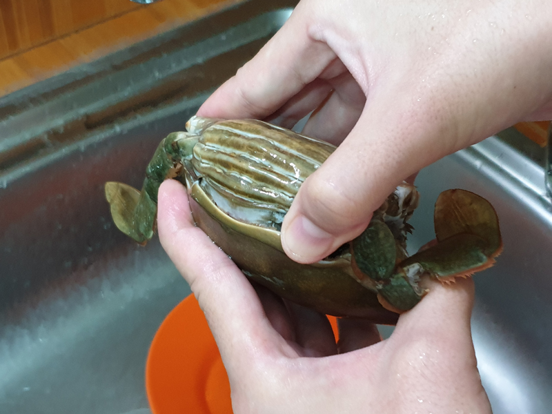 1. 게손질 : 솔을 사용해서 흐르는 물에 관절 사이사이를 깨끗이 닦아줍니다. 앞쪽 배 껍데기와 입은 과감하게 떼어버립니다. 잘 닦아도 머드크랩 이름답게 흙냄새가 나는데 남아있는 비린내는 나중에 마늘과 후추, 소주가 잡아줄거라 크게 신경쓰지 않으셔도 됩니다.