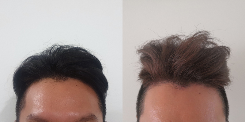 사진 촬영한 벽면 색이 달라서 그렇지 피부톤을 보시면 동일한 밝기에서 촬영한 것이라는 걸 알 수 있습니다. 기존의 투블럭컷을 고수하다가 요즘 긴 머리 부분의 면적을 확장(?) 중이라 사진을 잘 보시면 경계 부분에 어정쩡한 스포츠머리 길이로 쓰리블럭컷이 되어 있는데 그 짧은 머리도 옆머리에 이염 없이 깔끔하게 잘 염색되었어요.