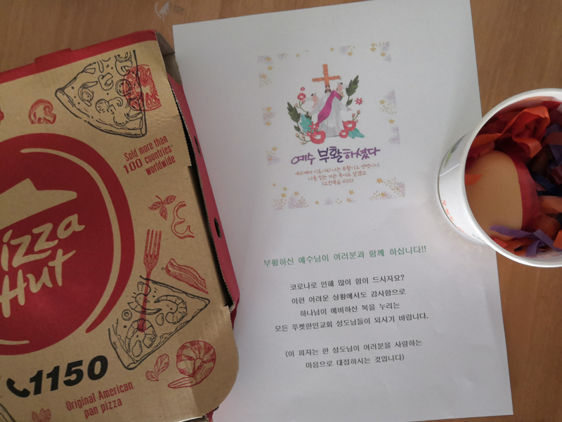 이번 주일은 부활절이었는데 글쎄 온라인 예배 후 목사님과 사모님께서 각 가정에 직접 부활절 달걀과 피자를 배달해주시고 가셨답니다.