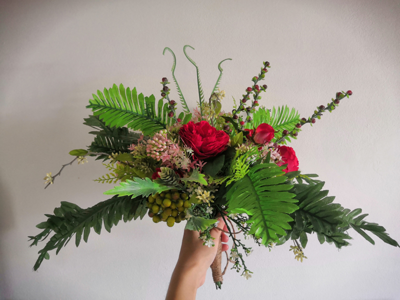 그리고 이건 저의 부케에요. 옆으로 풍성한, 그리고 들꽃 느낌나는 분위기를 원해서 그린과 레드 컬러를 조합하여 만들었습니다.
