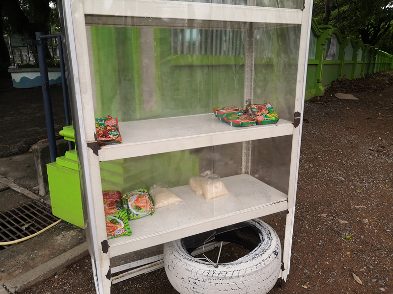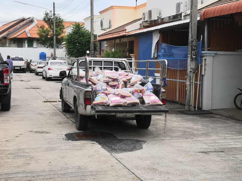 저희 무반단지 바로 옆이 초등학교인데요. 지금은 학교 개학도 미뤄진 상태이고 온라인 수업을 준비 중이라고 합니다. 학생들이 없는 학교 정문 앞에 이렇게 무료 식량을 놓아두었어요. 누구나 어려운 사람들은 가져가서 끼니를 해결하라고 설치해두었더라구요. 이곳 말고도 여기저기 무료 급식을 해주는 식당들도 많이 있답니다. 전부 자발적인 기부를 받거나 페이스북 등을 통해 무료 봉사로 운영되고 있어요. 이런 풍경은 우리나라나 태국이나 참 사람 마음을 말랑하게 해주는 것 같아요.