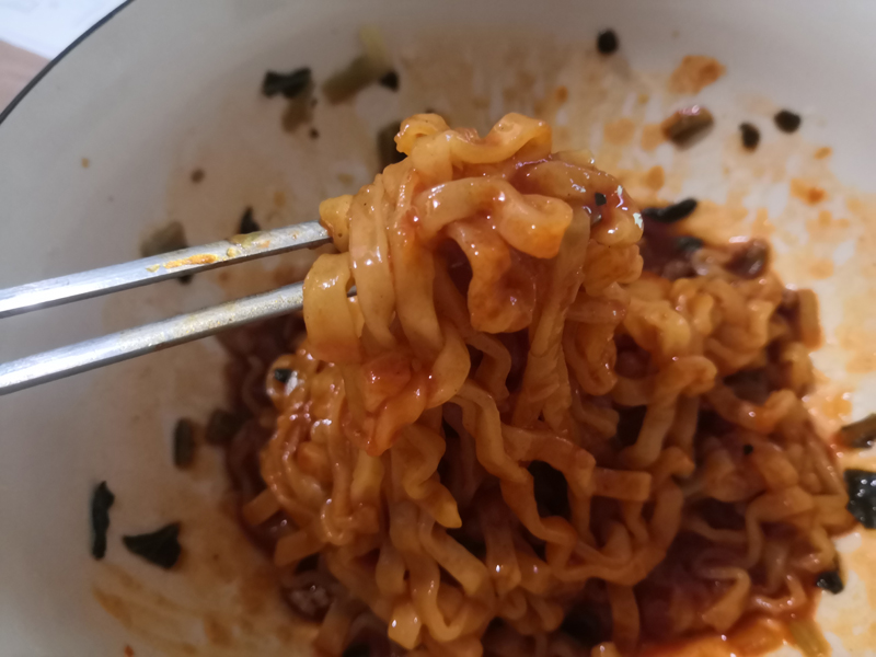 자극적인 스프향이 짙어서 맵고 독한 맛일줄 알았는데 그것도 아니고 이건... 맛있게 매운 맛이에요! 설명하긴 참 어렵지만 불닭볶음면과 굳이 비교하자면 불닭볶음면보다 살짝 덜 매우면서 면발은 더 찰지고 그냥 맵다기보다는 풍미가 있는 매운 맛이라서 이거이거~ 매콤하면서 향신료나 허브가 들어간 음식들을 좋아하시는 분들이라면 중독될 수도 있겠다 싶었어요!