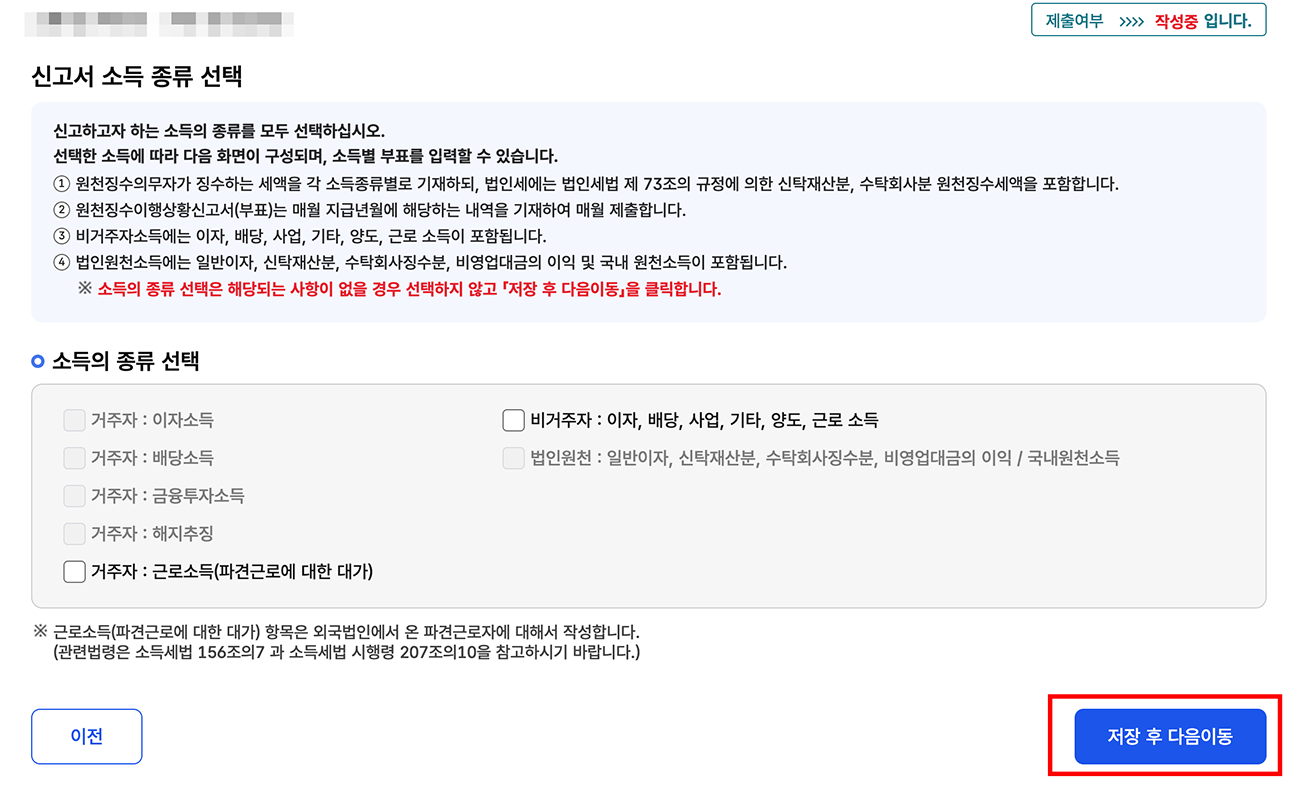소득의 종류 선택에서는 아무것도 체크하지 않고 바로 <저장 후 다음이동>하면 끝!