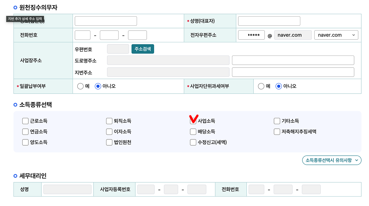 모든 칸을 채우고 소득종류선택 >> 사업소득 체크!