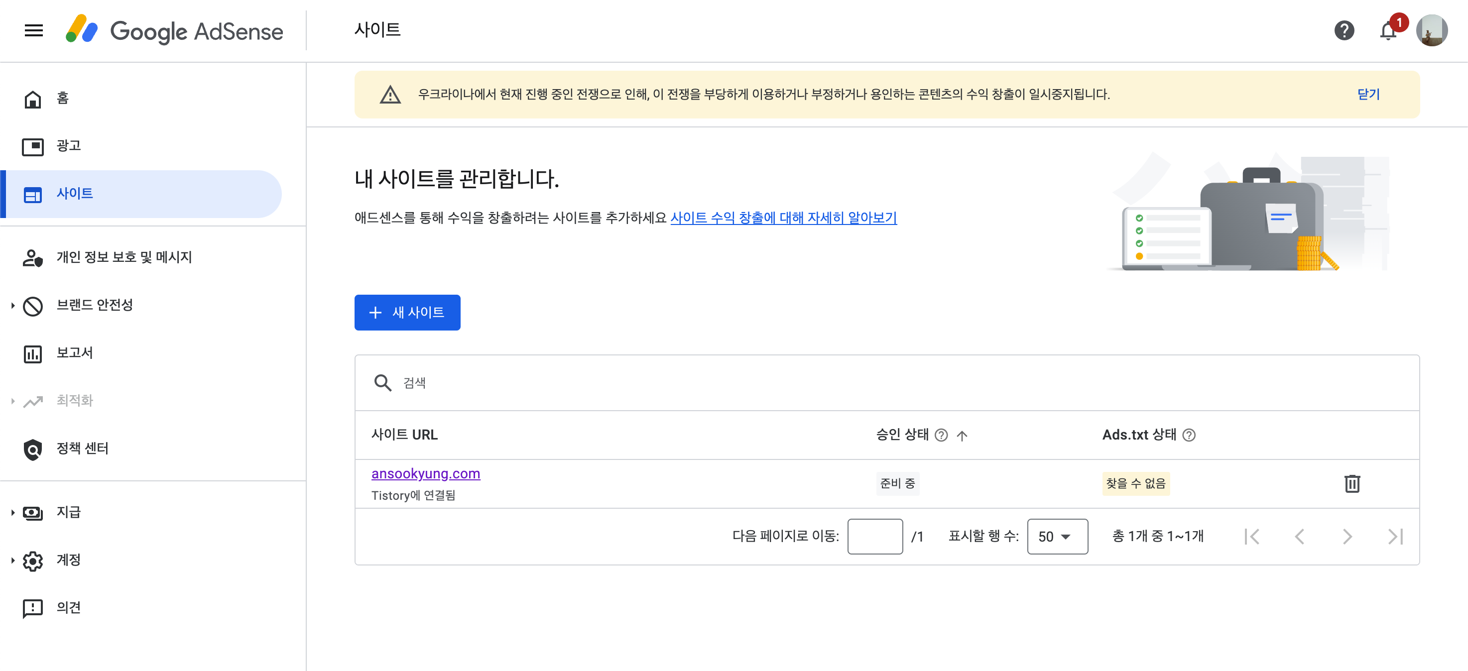 이럴수가... 애드센스에 들어가보니까 위와 같이 빨간색 경고 UI가 똭!