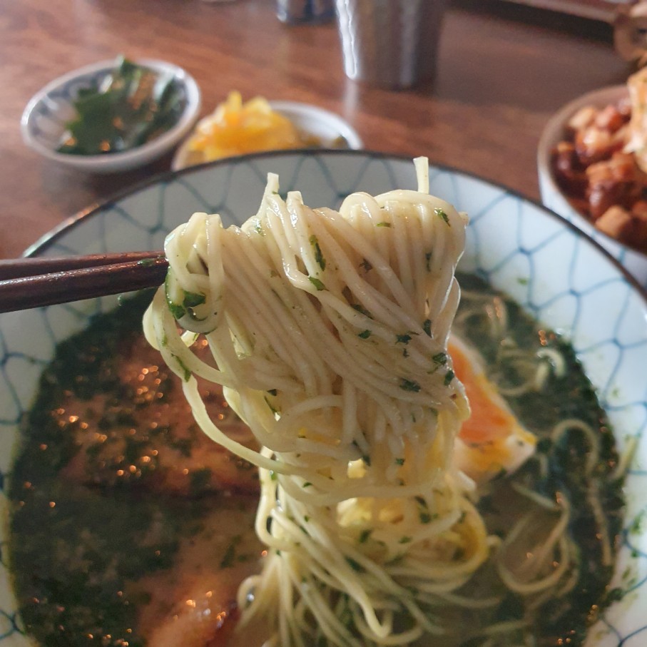 미도리케메는 기본 라멘인 키츠네에 바질을 넣은 컨셉의 라멘이었는데요. 저처럼 향신료나 허브를 엄청엄청 좋아하는 사람에게는 조금 더 향이 강했으면 하는 아쉬움이 있더라구요. 아무래도 동남아 향신료 강도에 적응이 된 것 같습니다. 다른 분들의 리뷰를 보니까 바질 향이 진해서 대부분 만족해 하셨거든요.