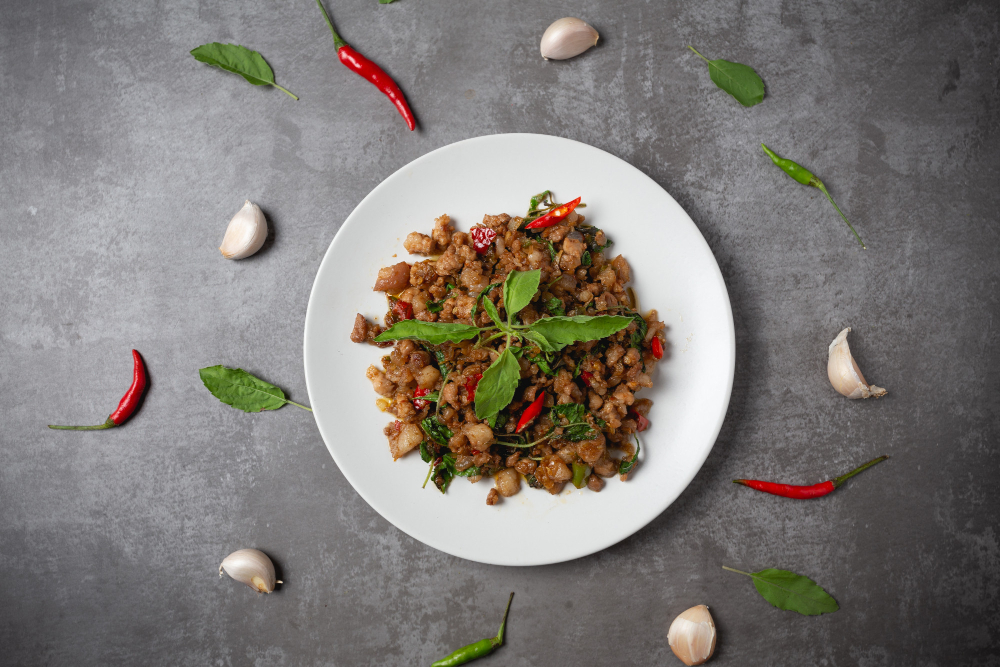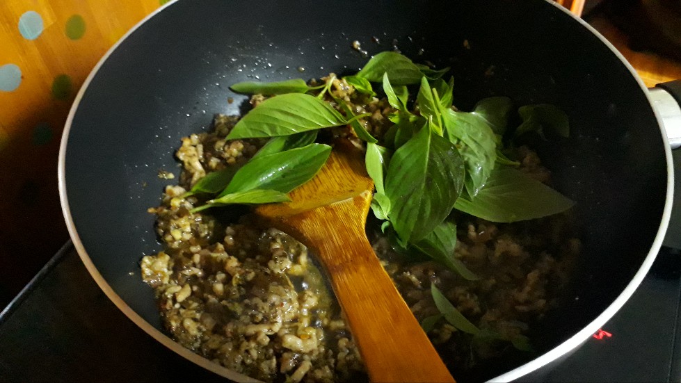 팟끄라파오무쌉은 태국어로 팟 : 볶다, 끄라파오- : 바질, 무쌉 : 다진 돼지고기라는 뜻이에요.