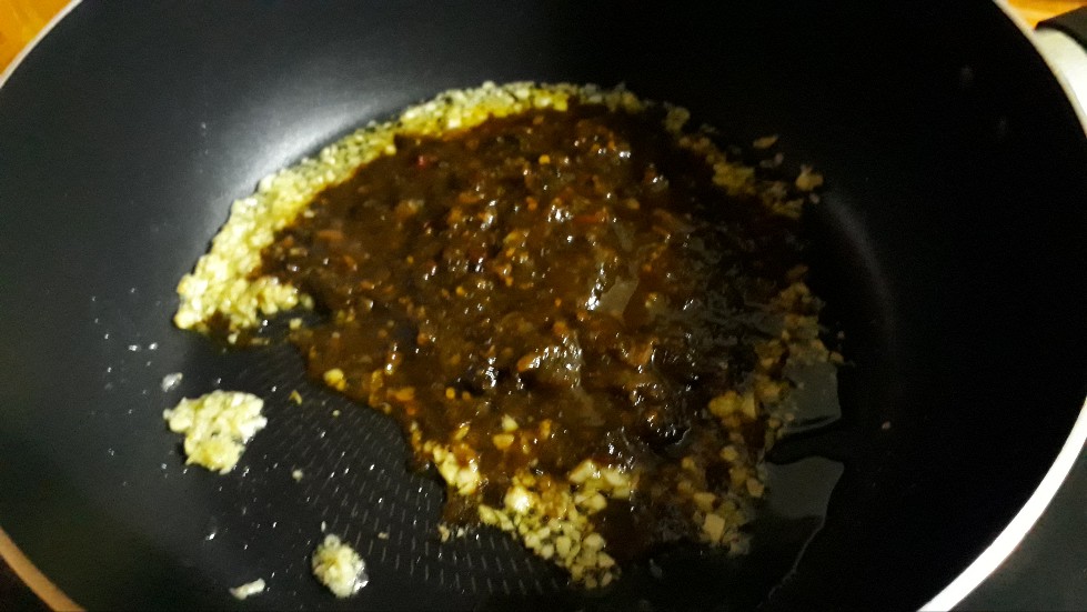 2. 마늘은 약 1분 정도 볶아주다가 팟끄라파오무쌉 소스를 넣어줍니다.