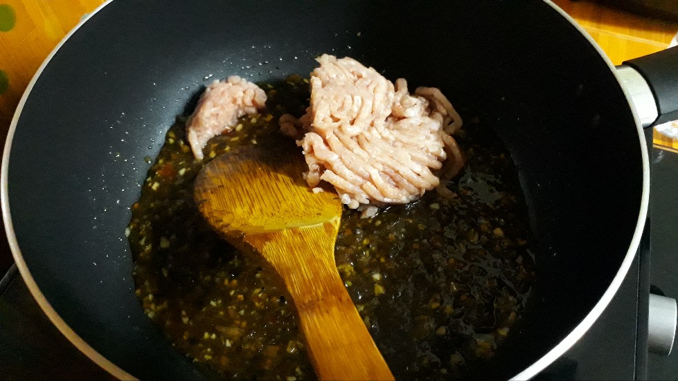 3. 중불에서 소스가 보글보글 끓을 정도로 볶아지면 다진 돼지고기를 투하해 줍니다.