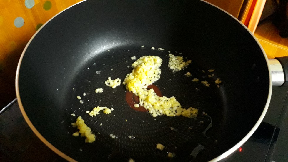 1. 먼저 기름을 넉넉히 두른 후 다진 마늘을 한 숟가락 정도 볶아줍니다.