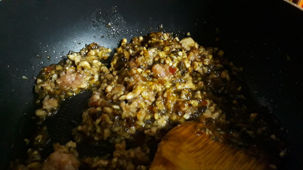 원래는 저렇게 소스가 자작하게 남지 않고 다진 돼지고기에 다 베어들어야 합니다.