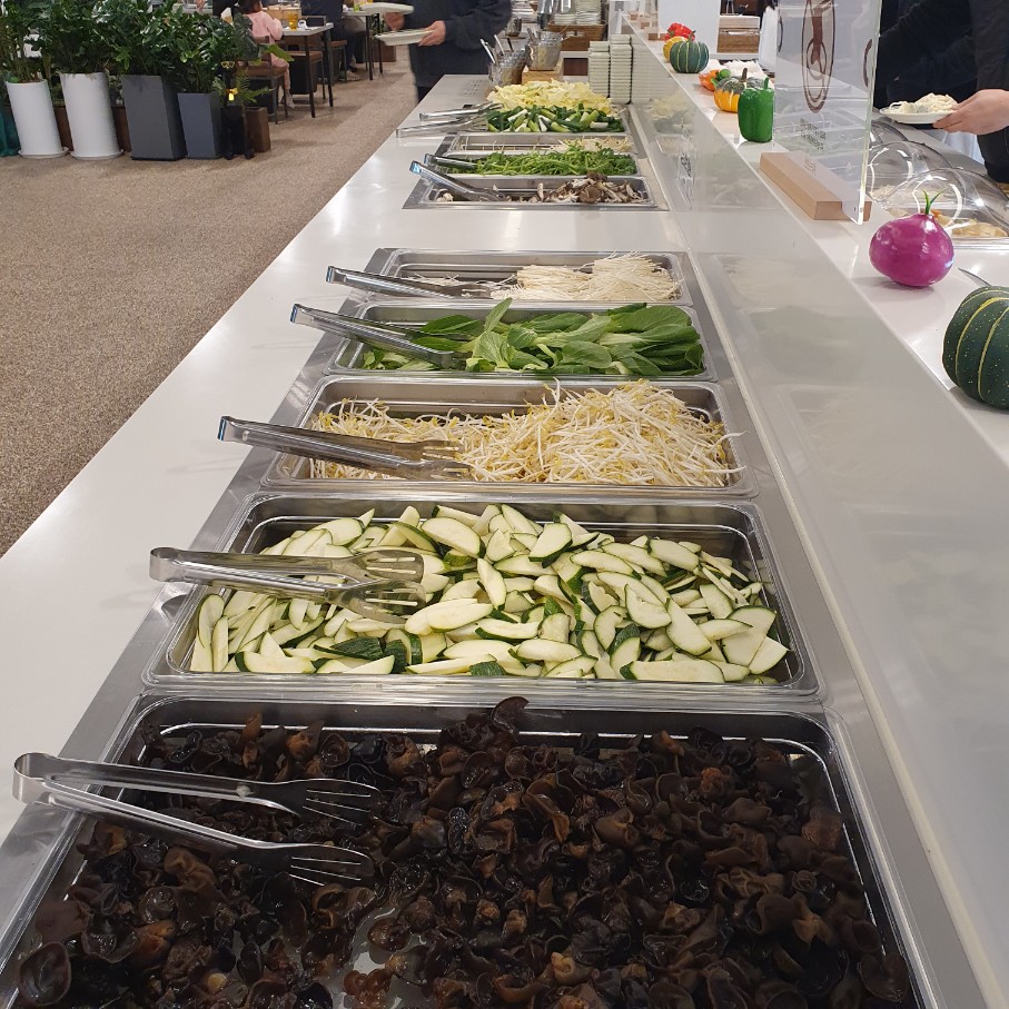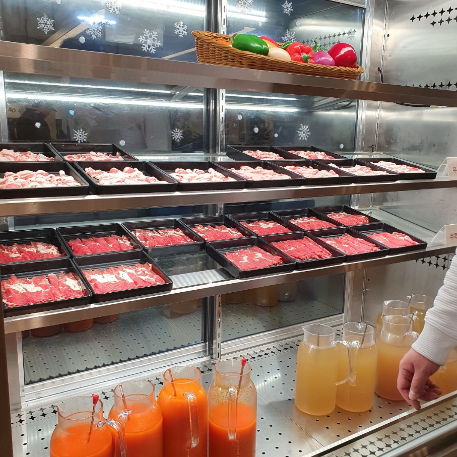 고기는 요런식으로 진열되어 있어서 종류별로 가져갈 수 있고, 밑에 매운 국물과 안매운 국물을 리필할 수 있어요.