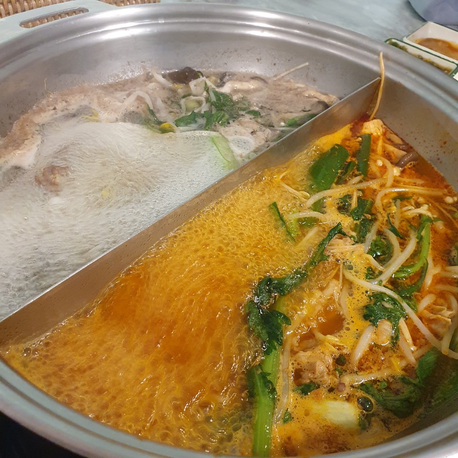 기본 팟이 제공되어서 이렇게 두가지맛의 샤브샤브를 즐길 수 있구요.